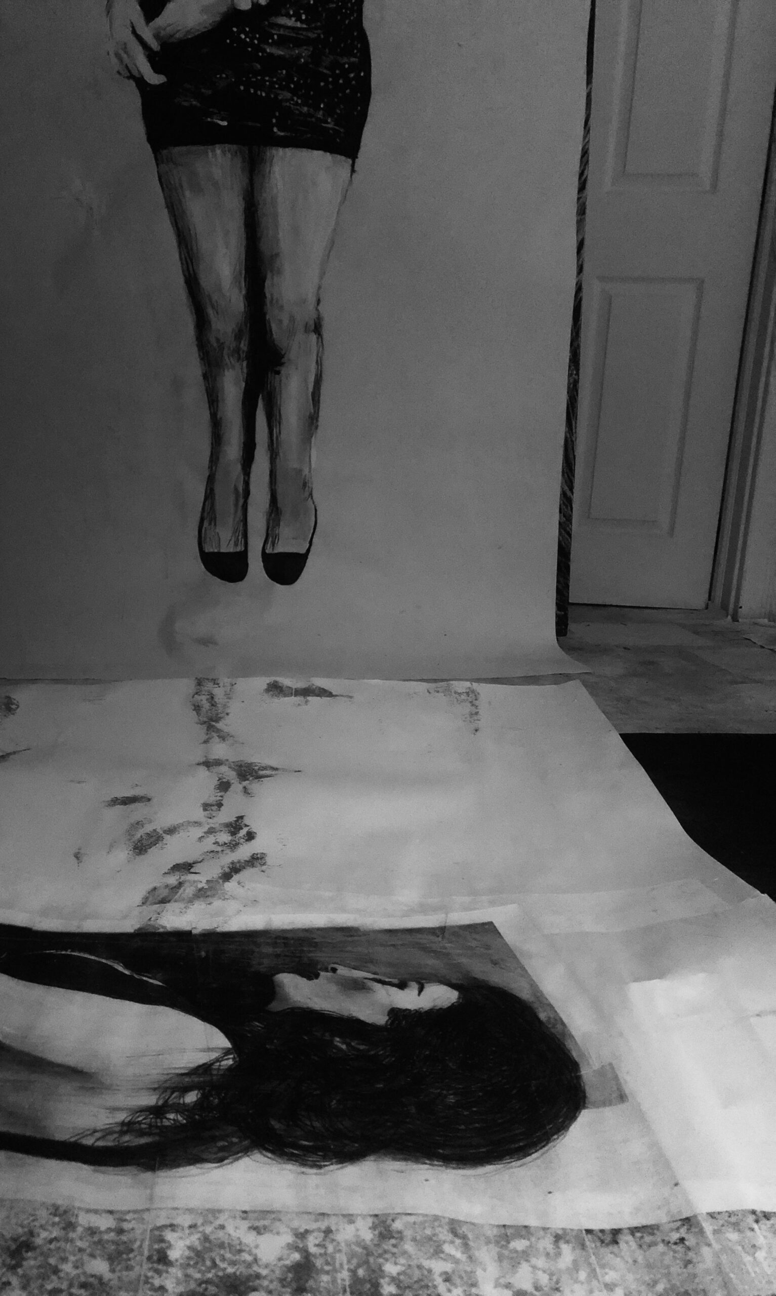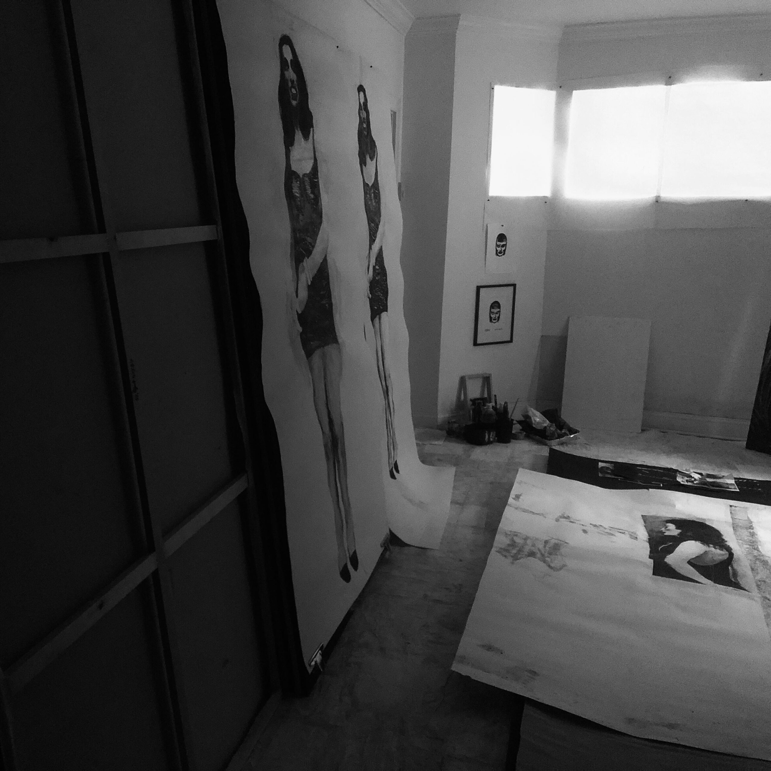 It is a series of large paintings, a set of tools, rolls of paper, canvases of different sizes, reference prints, paper notes, pencils, chalks, bottles, containers… The show must go on!