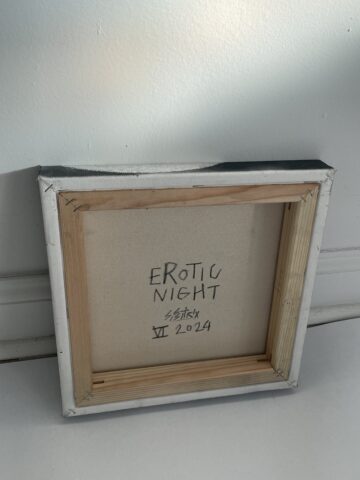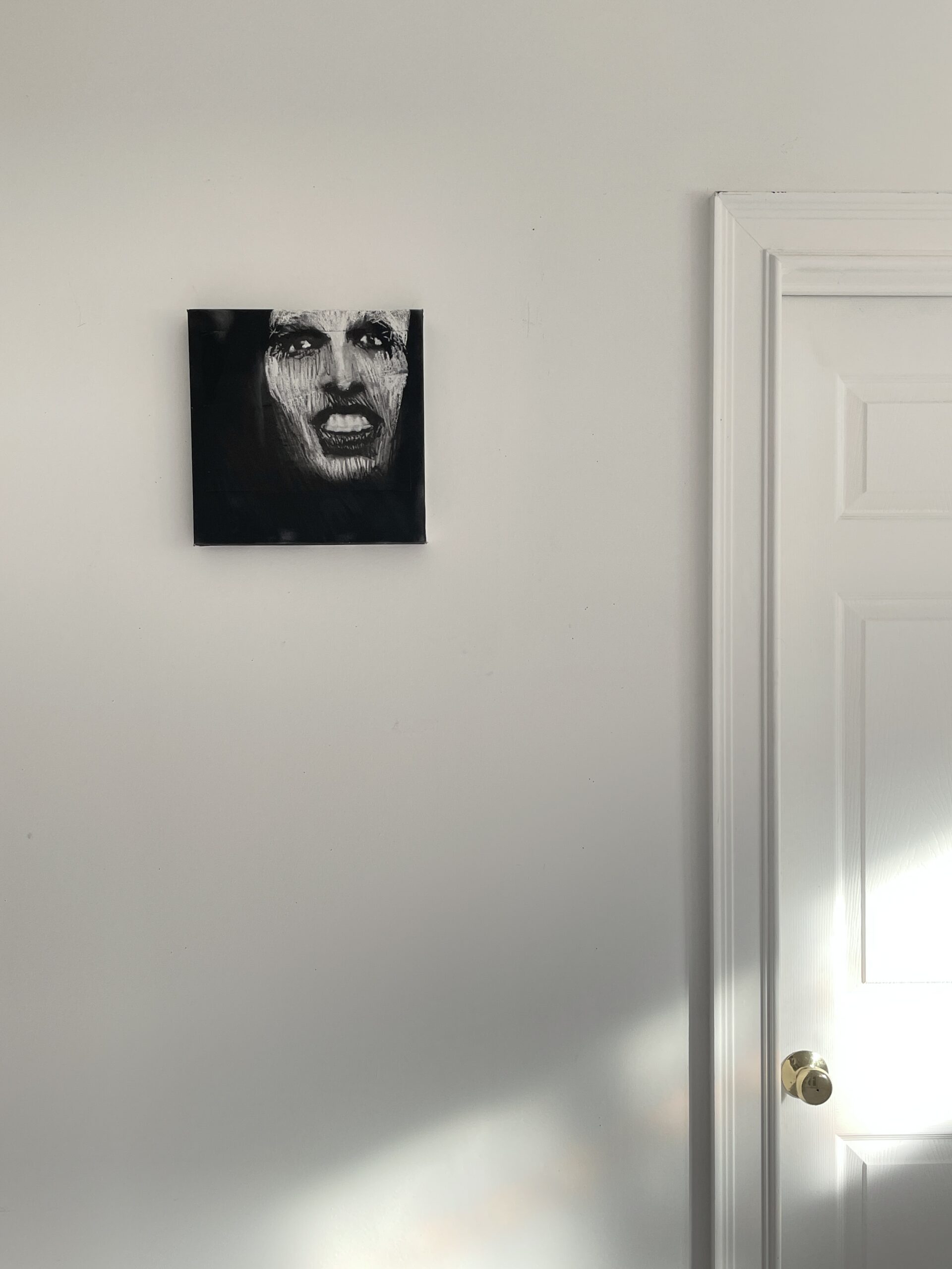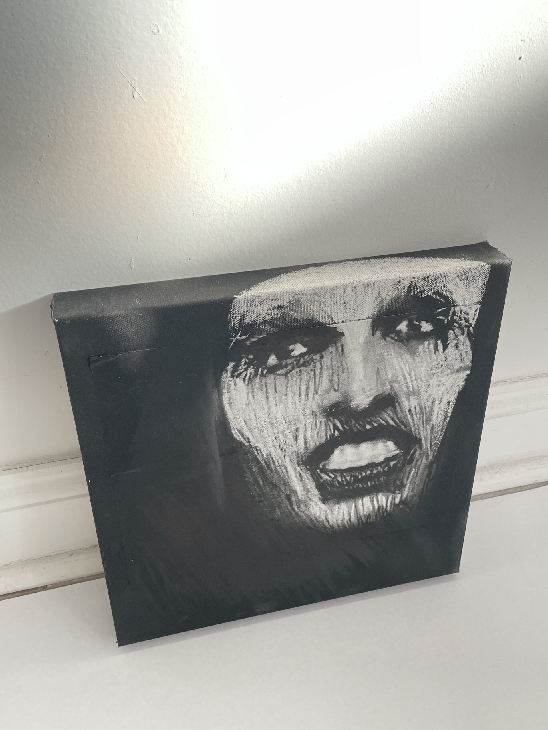 Laser print, black pencil, and white chalk on prepared black canvas.30.5 x 30.5 cm / 12 x 12 in