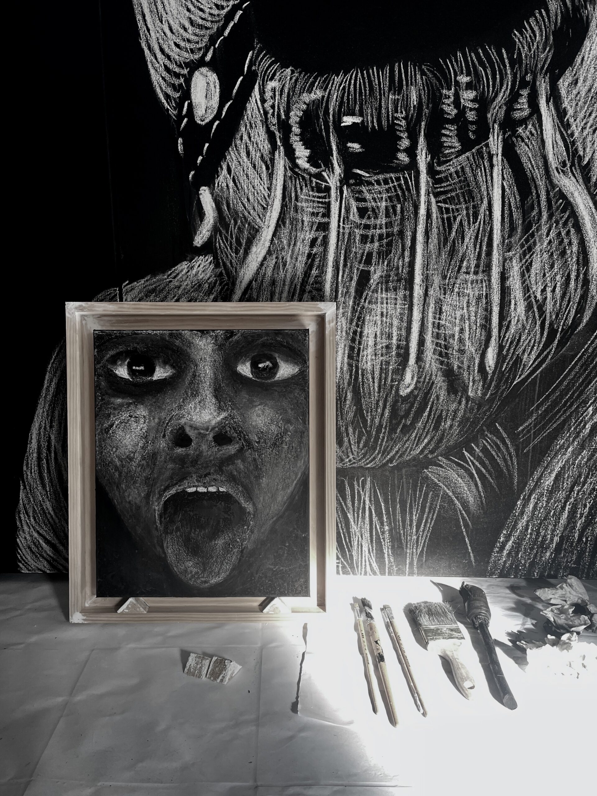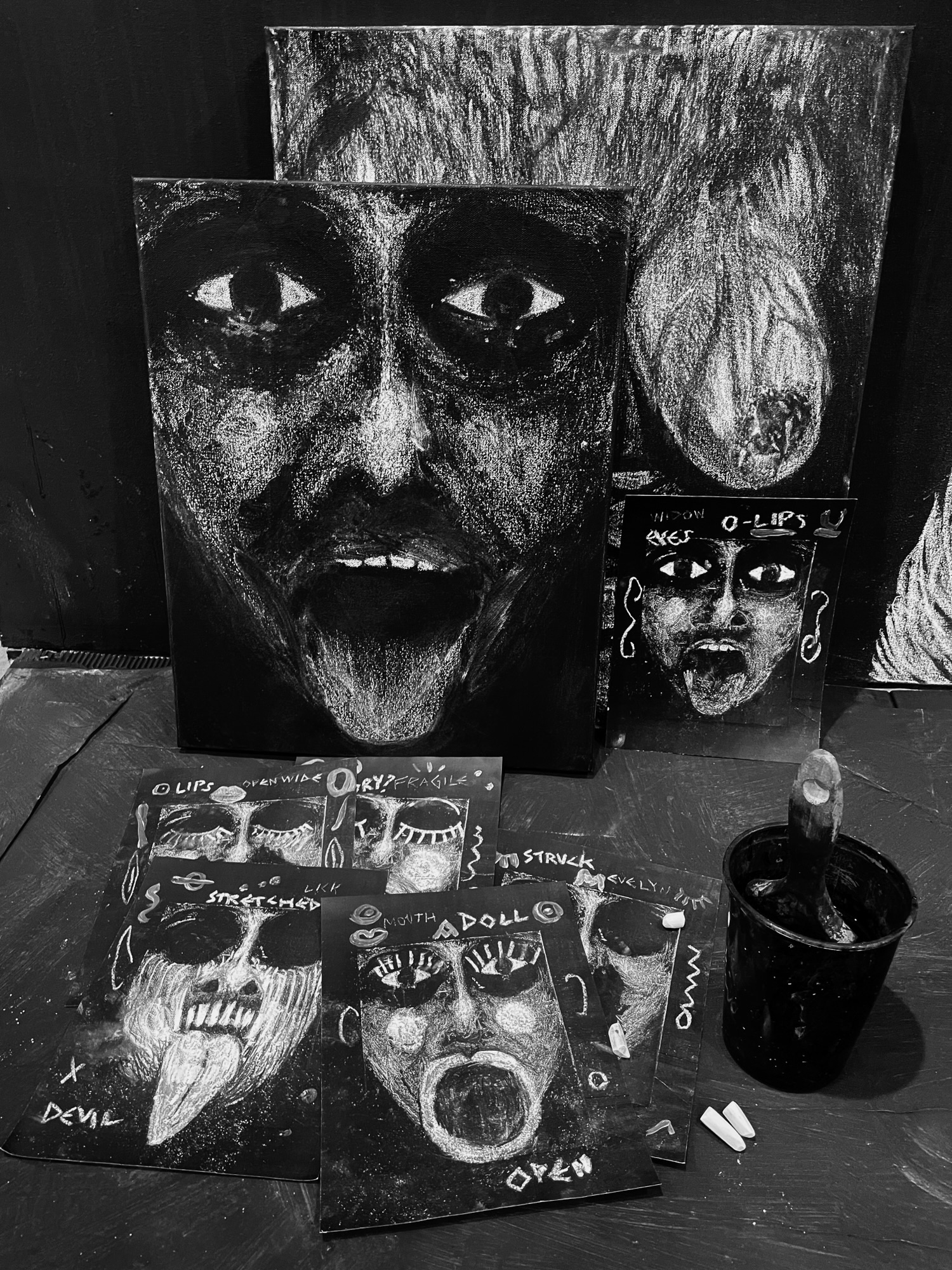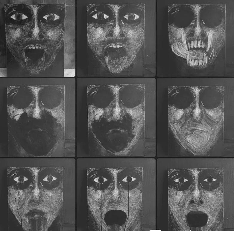 I have painted one face five times—each iteration rubbed out of pitch-dark ground with chalk and desperation, each one a little wider at the mouth than the last.
